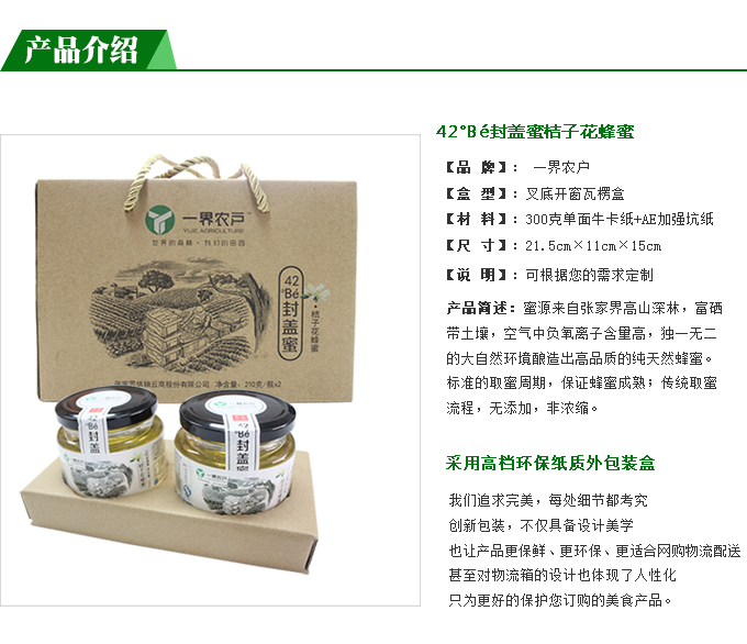 42°Bé封蓋蜜桔子花蜂蜜采用高檔環(huán)保紙質(zhì)外包裝盒,我們追求完美,每處細(xì)節(jié)都考究;創(chuàng)新包裝,不僅具備設(shè)計(jì)美學(xué),也讓產(chǎn)品更保鮮、更環(huán)保、更適合網(wǎng)購(gòu)物流配送,甚至對(duì)物流箱的設(shè)計(jì)也體現(xiàn)了人性化,只為更好的保護(hù)您訂購(gòu)的美食產(chǎn)品。